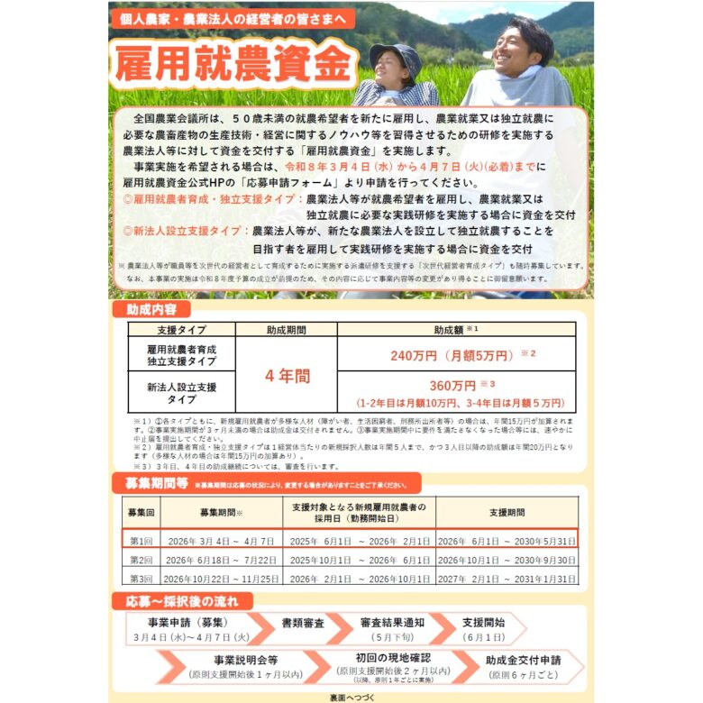 みだしのことについて、令和8年6月からの事業開始を希望する経営体を、令和8年3月4日~4月7日まで募集しますので、雇用就農資金HPの「応募申請フォーム」から申請を行ってください。